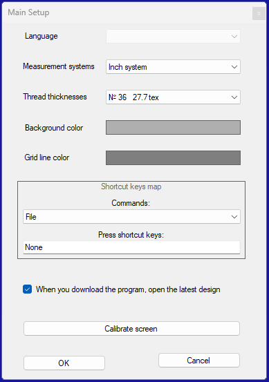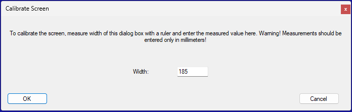 تعد معايرة الشاشة ضرورية لإعادة إنتاج أبعاد التطريز بدقة على الشاشة. بعد النقر على زر "معايرة الشاشة"، ستظهر النافذة التالية حيث سيُطلب منك قياس عرضها. يرجى ملاحظة أن جميع القياسات يجب أن تؤخذ بالملليمتر.